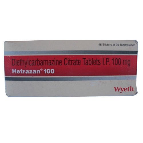Hetrazan 100 mg Tablet is an antiparasitic specialist utilized for the avoidance and treatment of worm diseases which may cause serious expansion of the arms, legs, and privates. It might likewise be utilized for the avoidance and treatment of worm diseases of the eye which may cause visual deficiency and worm contaminations which may cause joint, connective tissue, sensory system, or breathing issues. It isn’t prescribed to forestall or treat the diseases brought about by pinworms and tapeworms.